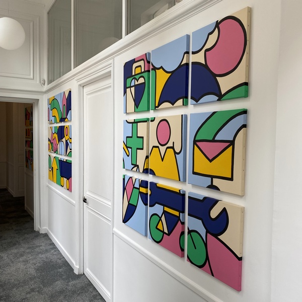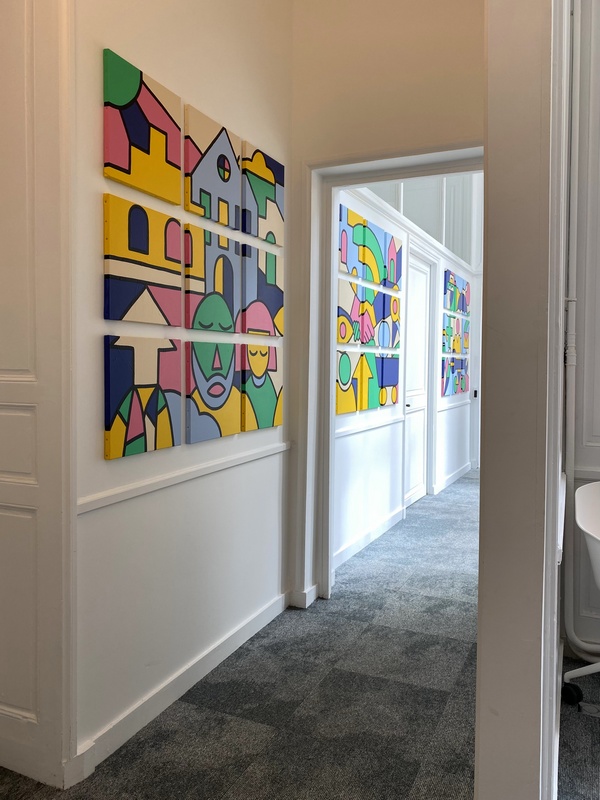 Depuis plus de 80 ans, originaire du Nord, la Mutuelle GSMC s’engage dans la protection sociale. Ce team-building a été réalisé avec les administrateurs de la mutuelle, afin de réaliser des toiles pouvant orner le siège de la mutuelle, situé à Lille. Lors d’une journée à l’hôtel Clarance, une fresque collaborative a ainsi pu être réalisée par les administrateurs, reprenant les symboles graphiques incarnant l’activité de la mutuelle. Les couleurs sont issues de la charte graphique de la mutuelle, une vingtaine de toiles ont ainsi pu être réalisées, avant d’être accrochées aux murs du siège: